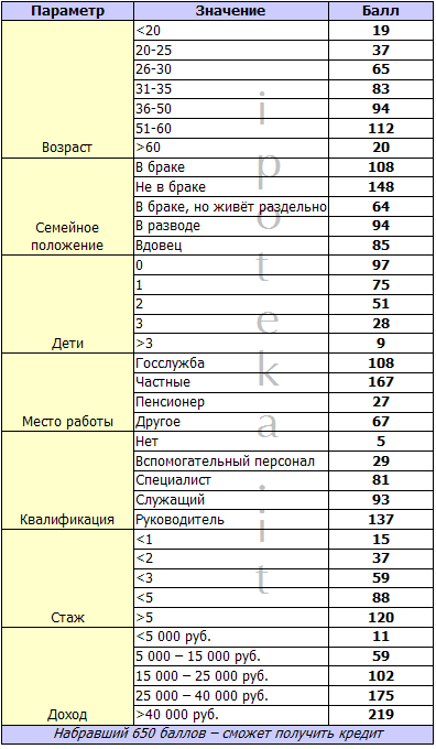 Данную табличку не рекомендую расценивать как пособие для афериста — скорее, тут можно понять (конечно, очень приблизительно) почему у Вас будет отказ или одобрение в кредите.