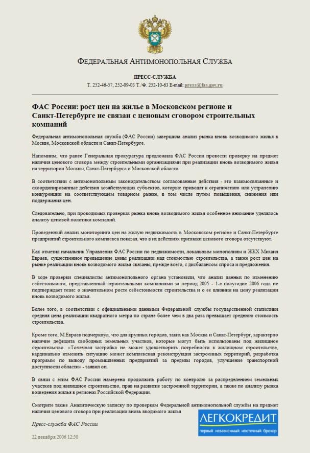 Как верно отметил Михаил Евраев (начальник управления ФАС по недвижимости, локальным монополиям и ЖКХ) рост цен связан в первую очередь с дисбалансом спроса и предложения. Следов сговора не нашли, с ростом цен на стройматериалы это тоже не связано и, хотя цена превышает себестоимость раза в два, но заставлять снижать цены только на этом основании - явно нерыночная мера.